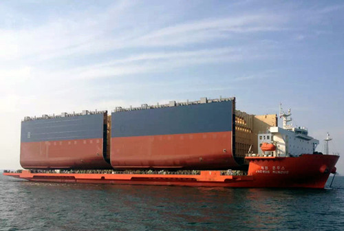 2015年9月17日,威海港引航站引航员成功引领满载两个超大型船段的自航驳船“金湾蒙杜斯”轮驶离荣成三星重工码头。 自航驳船“金湾蒙杜斯”轮,全长165米、船宽42米,装载两个长120米的超大船舶分段,船段总重量达到10264吨,排空多余压载水后的最大吃水也达到5.6米,各项数据均创荣成三星重工建厂以来之最。考虑到三星作业区平均航道宽度不足200米、港区平均水深小于8米等众多不利因素的制约,威海港引航站接到引航任务后,立即组织龙眼分站仔细论证,制定出了详细的引航方案和应急预案。执行作业任务的两名龙眼分站引航员,最终凭借精湛的引航技术和丰富的引航经验,顺利将“金湾蒙杜斯”轮引离三星重工码头U3泊位。